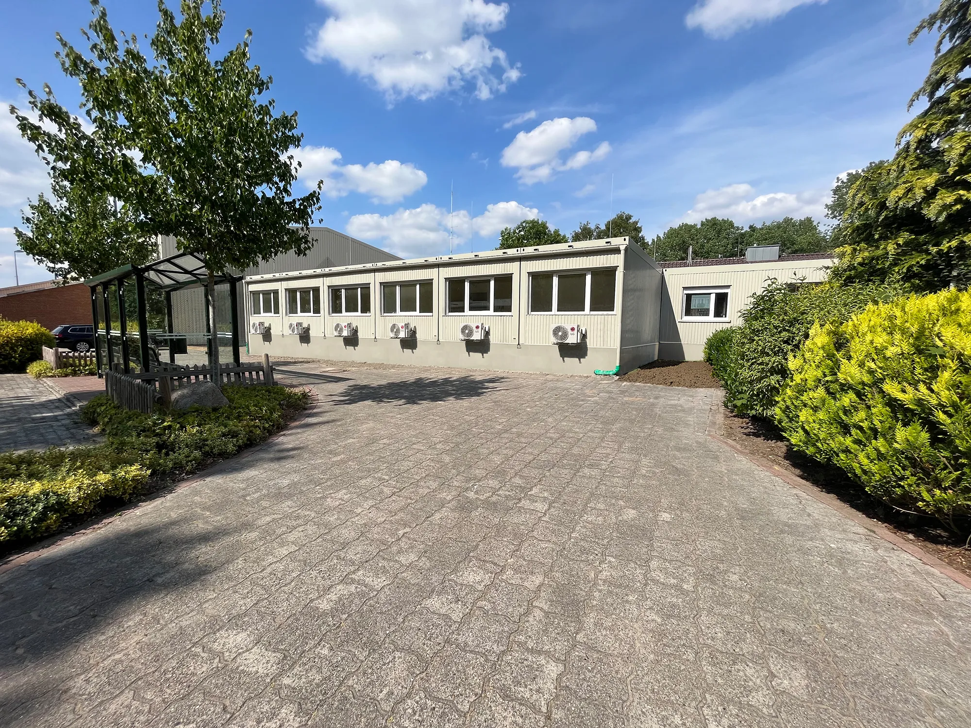 Die Außenverkleidung in RAL 7032 (Kieselgrau) sorgt für ein dezentes und funktionales Erscheinungsbild, das sich harmonisch in die Umgebung einfügt. Mit einem Gesamtauftragswert von 261.685,00 € (brutto) dokumentiert dieses Projekt unsere Kompetenz in der wirtschaftlichen und flexiblen Realisierung temporärer Bildungsbauten in Modulbauweise.
