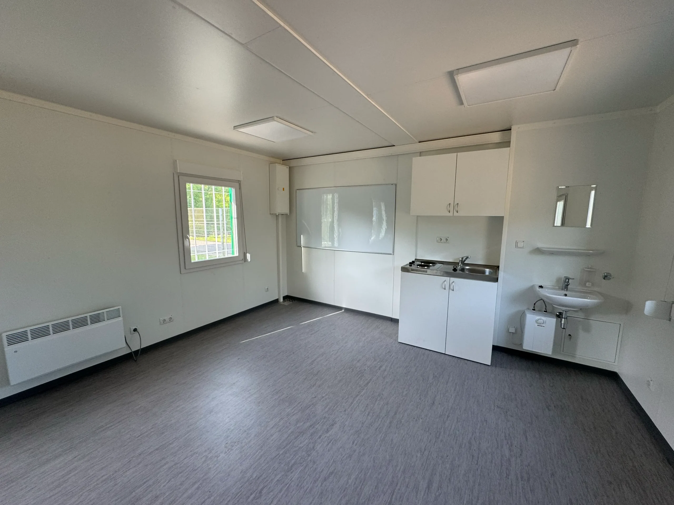 Im Innenbereich sorgen pflegeleichte Oberflächen, eine integrierte Miniküche sowie moderne Installationstechnik für einen praktischen und komfortablen Arbeitsraum. Die klare und effiziente Raumaufteilung unterstützt die tägliche Betriebsorganisation und schafft ein strukturiertes Umfeld für die Mitarbeitenden.