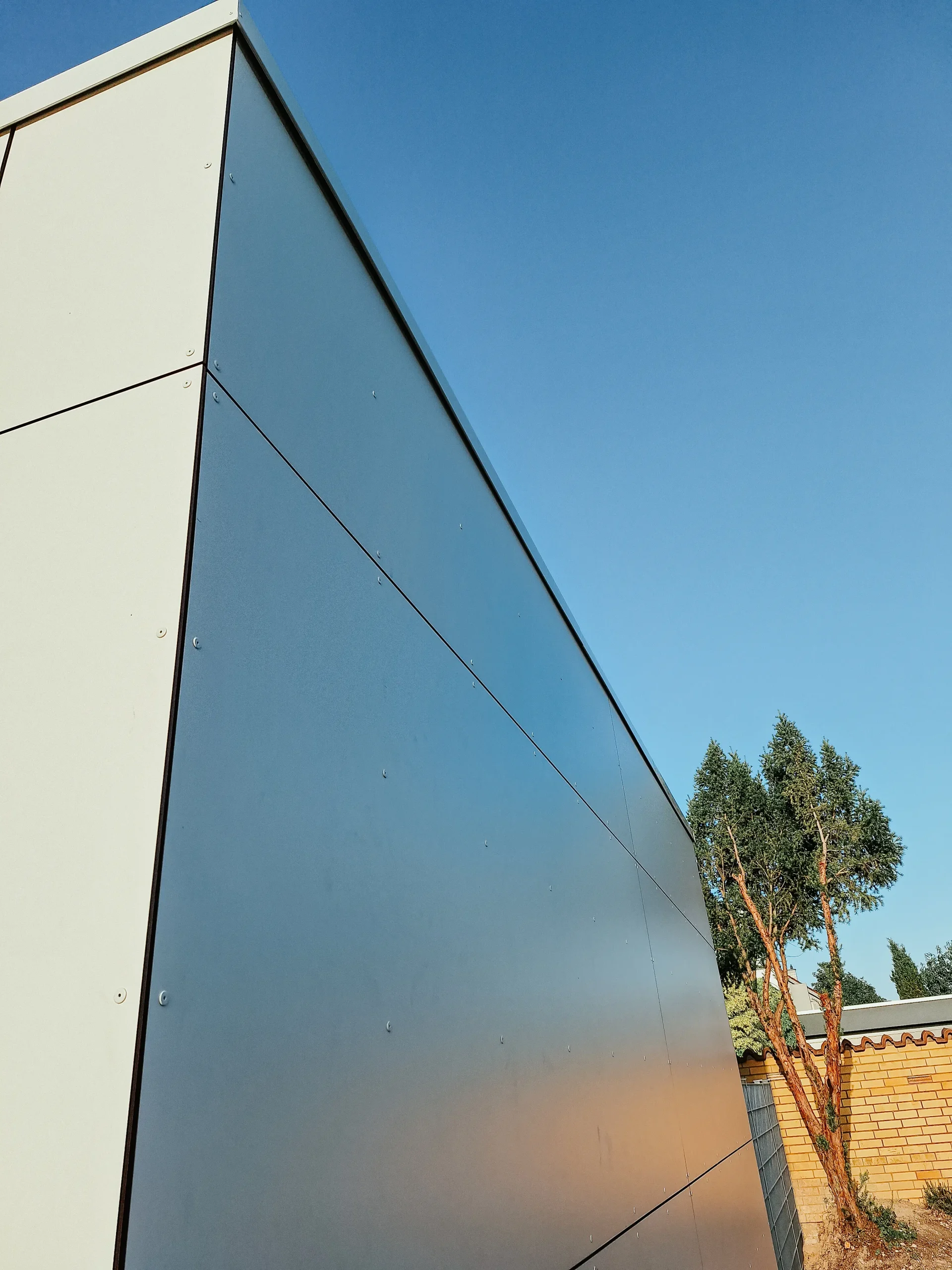 Die Anlage wurde in hochwertiger Modulbauweise errichtet und verfügt über eine Fassade aus HPL-Fassadenplatten in Kieselgrau, was dem Gebäude eine helle, freundliche und zugleich langlebige Optik verleiht. Durch den seriellen Fertigungsprozess konnte die Schulanlage innerhalb kurzer Zeit produziert und vor Ort montiert werden – ideal für Kommunen, die flexibel und schnell zusätzliche Unterrichtsflächen benötigen.