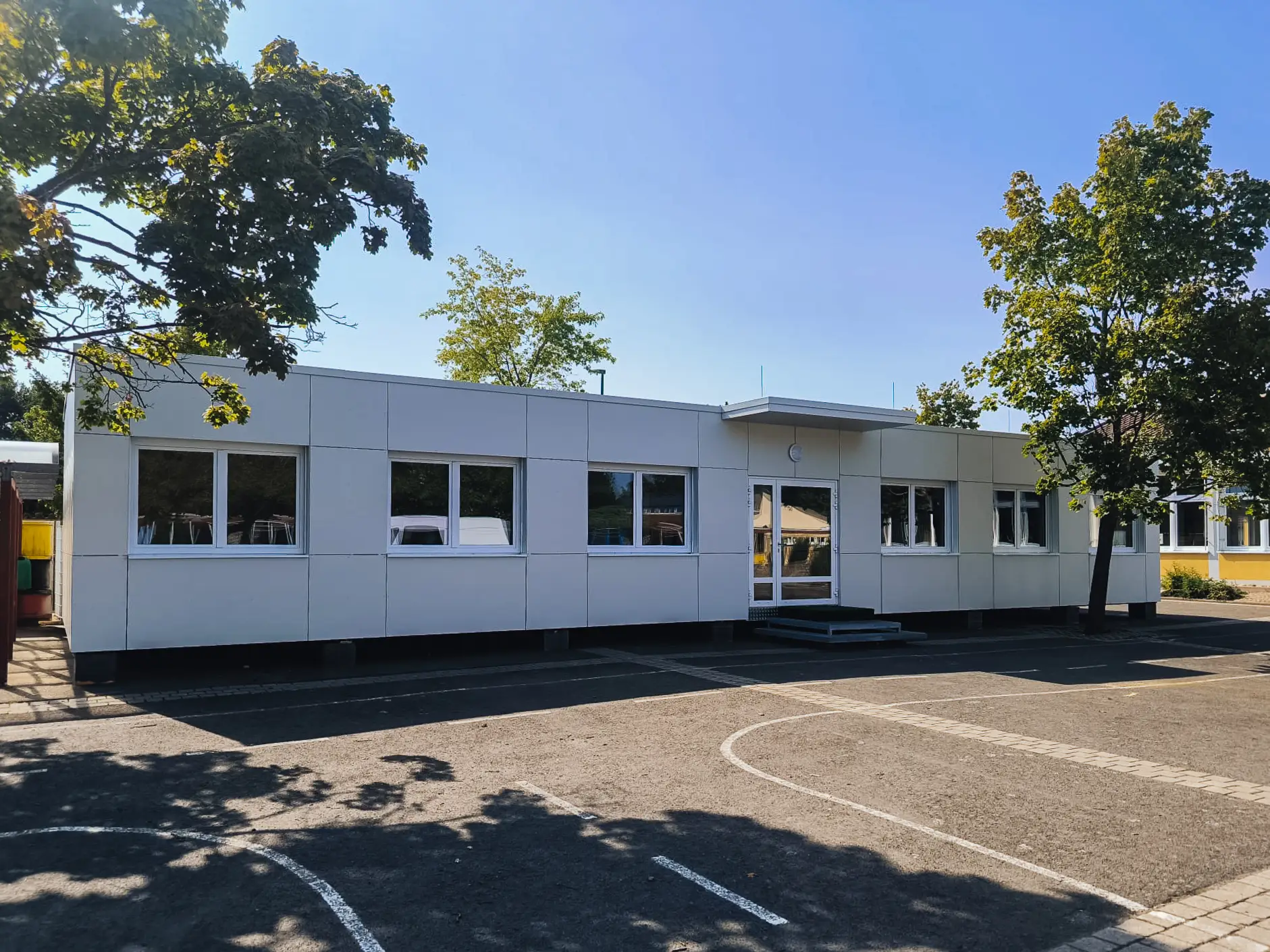 Die KIP Fertigbau-Bauträger GmbH hat in Flomborn eine moderne Containerschulanlage für die Verbandsgemeinde Alzey-Land realisiert. Das Modulgebäude besteht aus sieben Einheiten mit einer Gesamtfläche von rund 151 m² und bietet Raum für zwei vollwertige Schulklassen.