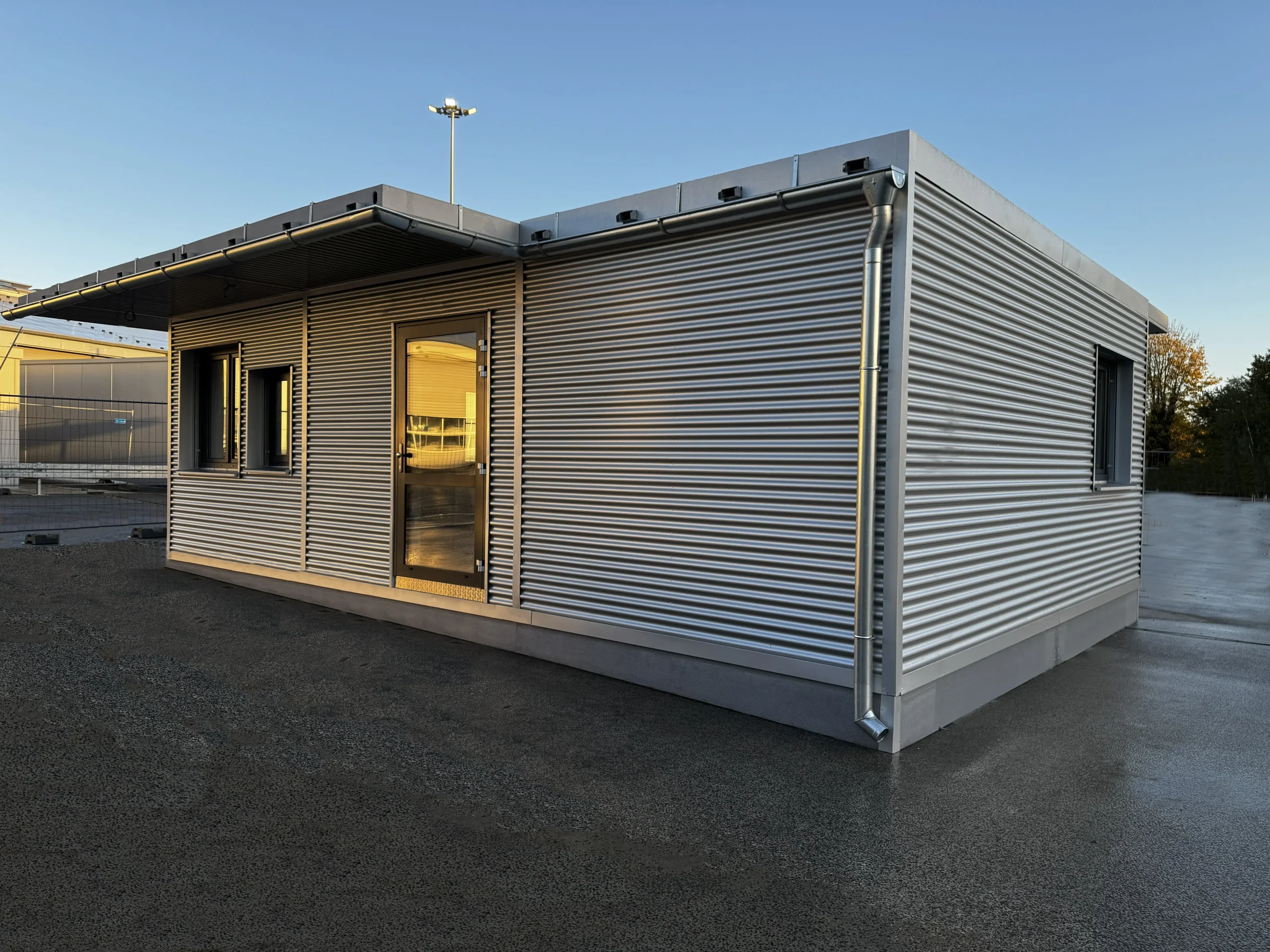 Die Außenhülle aus widerstandsfähiger Alu-Welle verleiht dem Modulgebäude eine robuste Optik, die perfekt zur industriellen Umgebung des Werksgeländes passt. Im Innenbereich sorgen großzügige Fensterflächen, moderne Büroflächen und funktionale Sanitärräume für optimale Arbeitsbedingungen im täglichen Werksbetrieb.