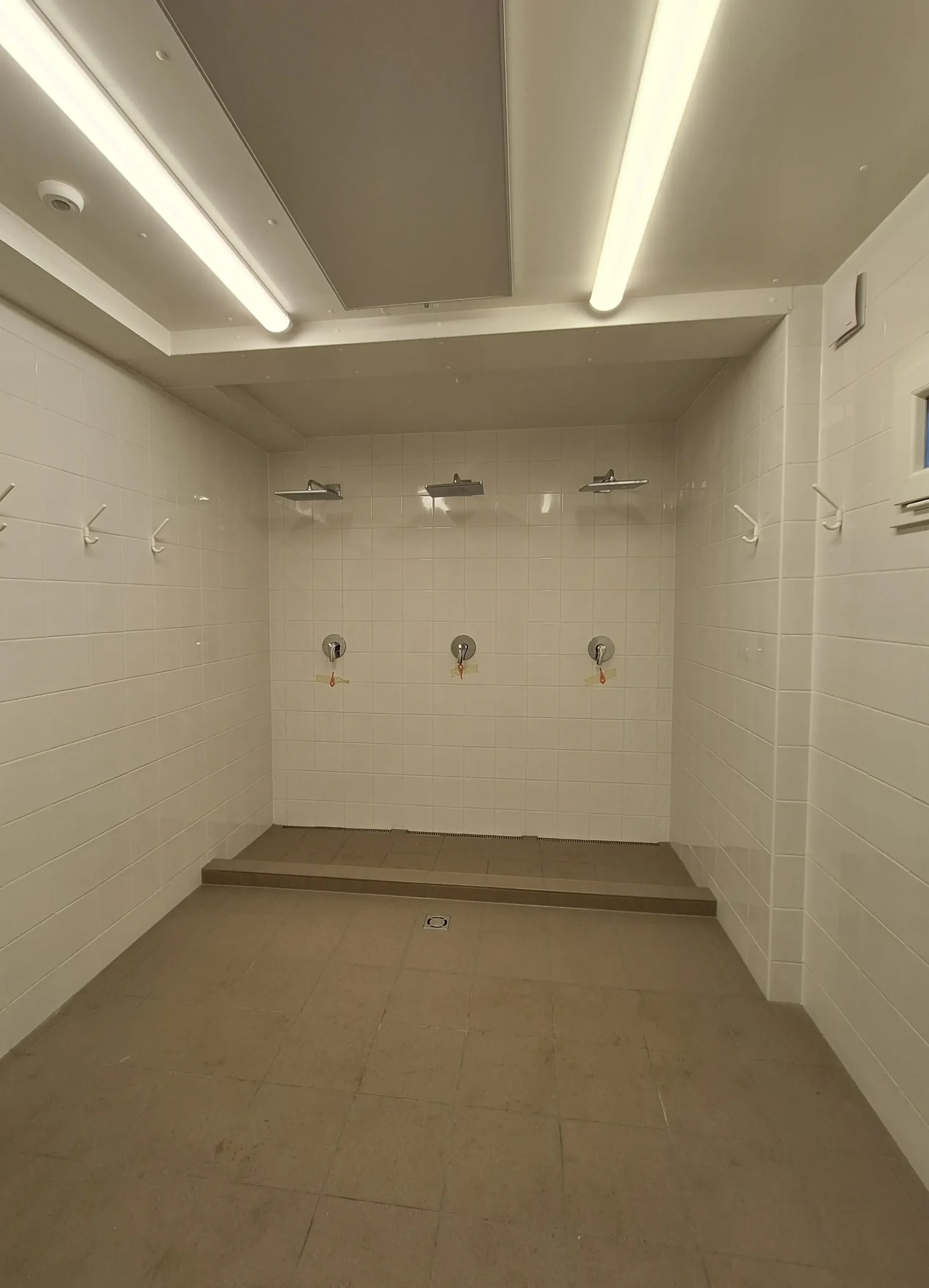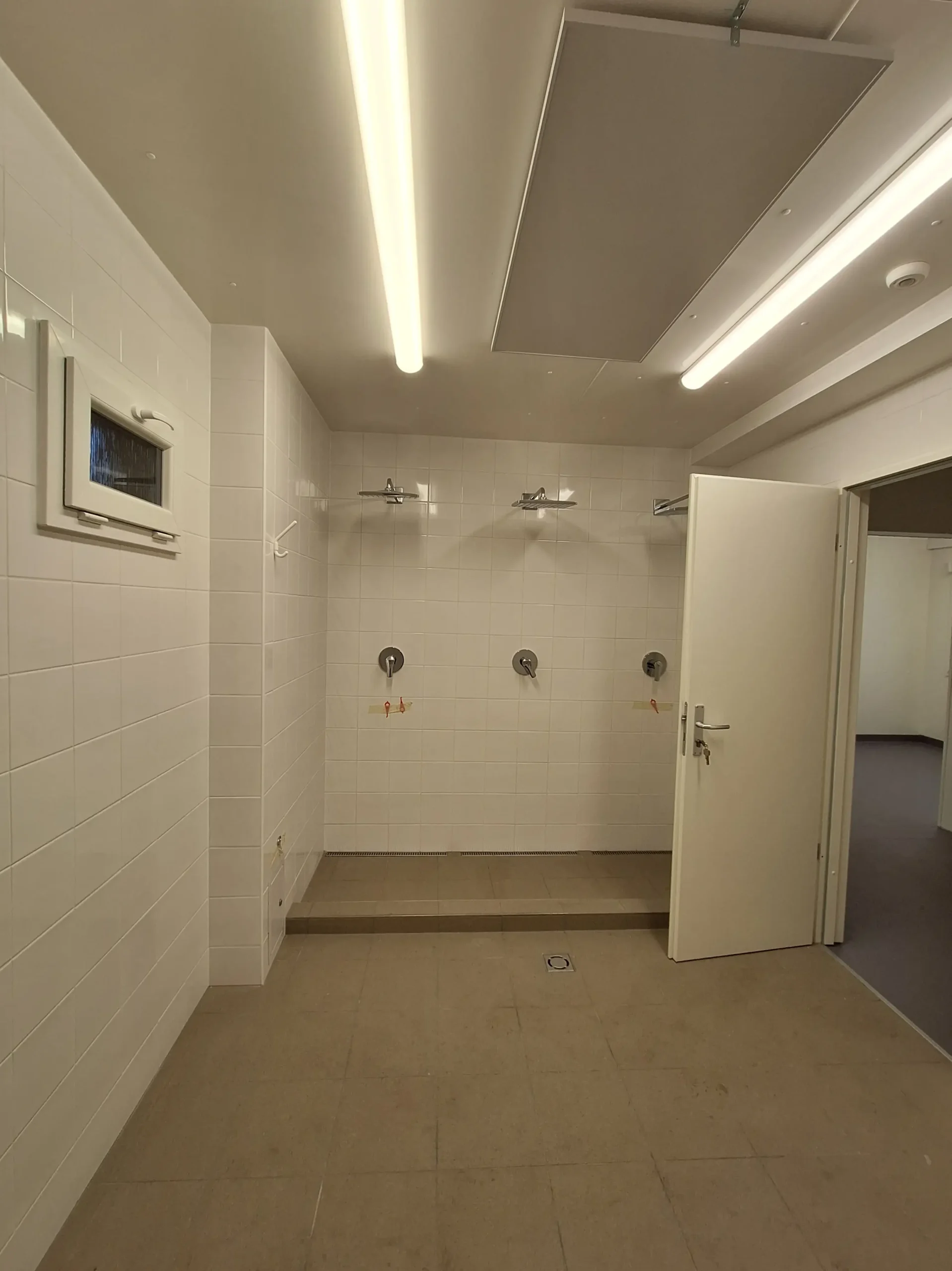 Im Innenbereich erwartet die Nutzer ein durchdachtes Raumkonzept: helle Umkleidezonen, moderne Sanitärbereiche sowie großzügige Duschbereiche mit pflegeleichten Oberflächen. Die robuste Ausstattung und die klar strukturierte Raumaufteilung bieten optimale Bedingungen für Trainings- und Spielbetriebe.